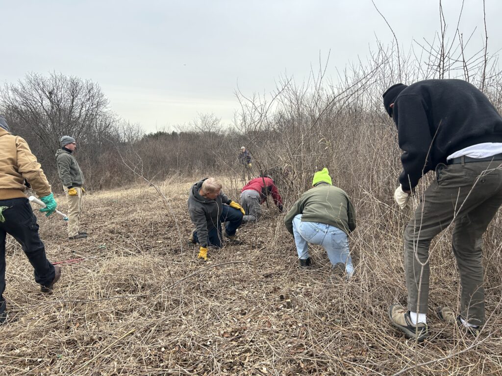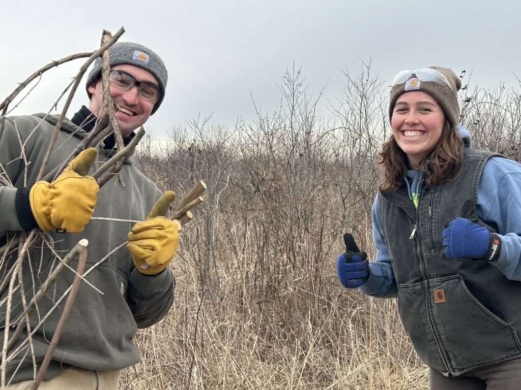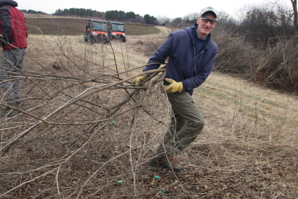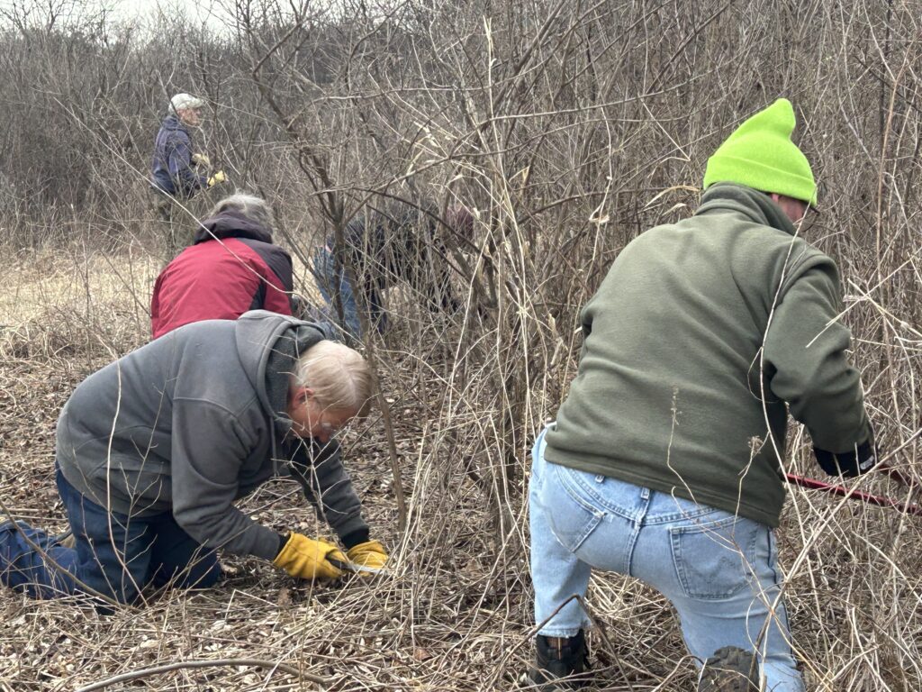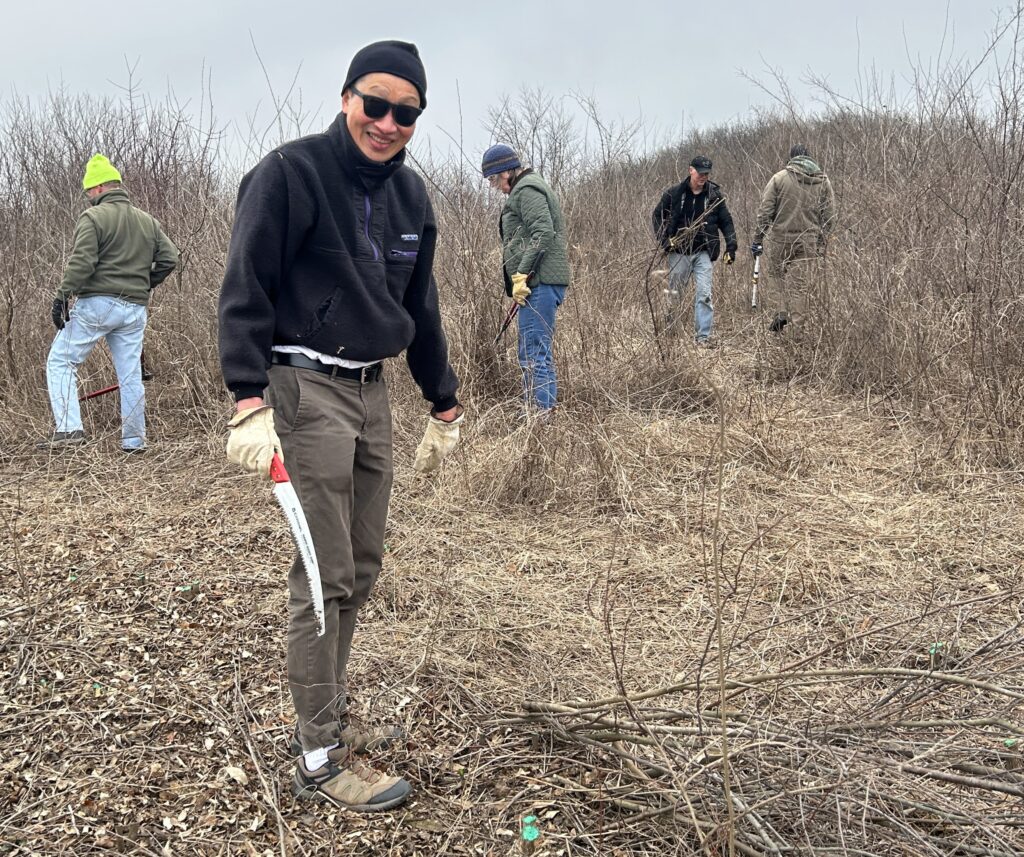 The workday was part of a multiyear project to clear a 43-acre section of shrubland overrun by invasive plants like honeysuckle, buckthorn, black cherry, and others. To date, 17 acres have been cleared. The restoration effort will support habitat for Yellow-breasted Chat, Bell’s Vireo, Brown Thrasher, Yellow Warbler, Gray Catbird, and other shrub-loving species.