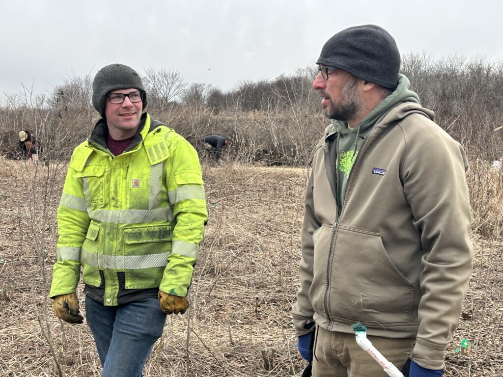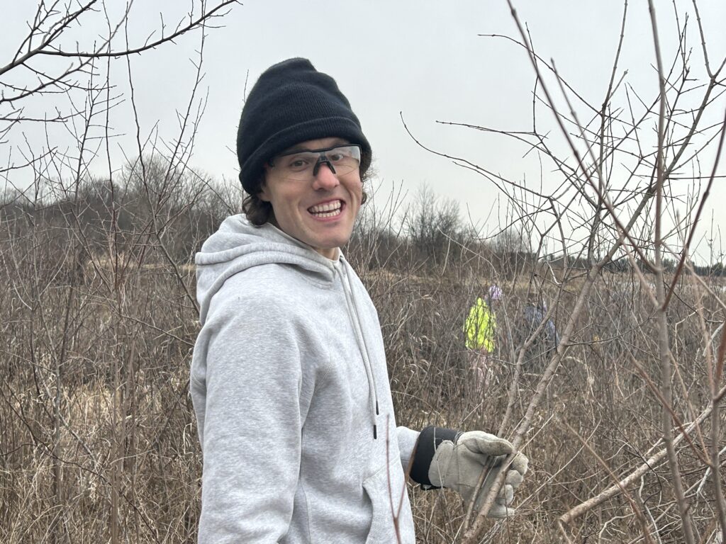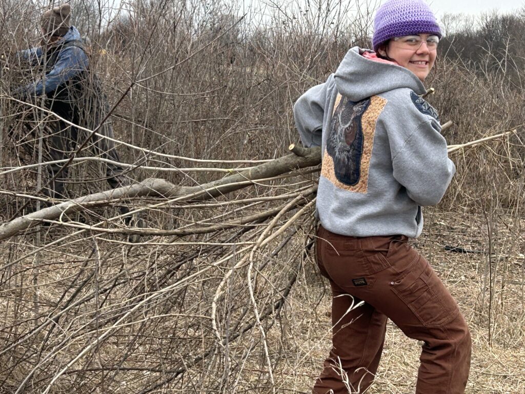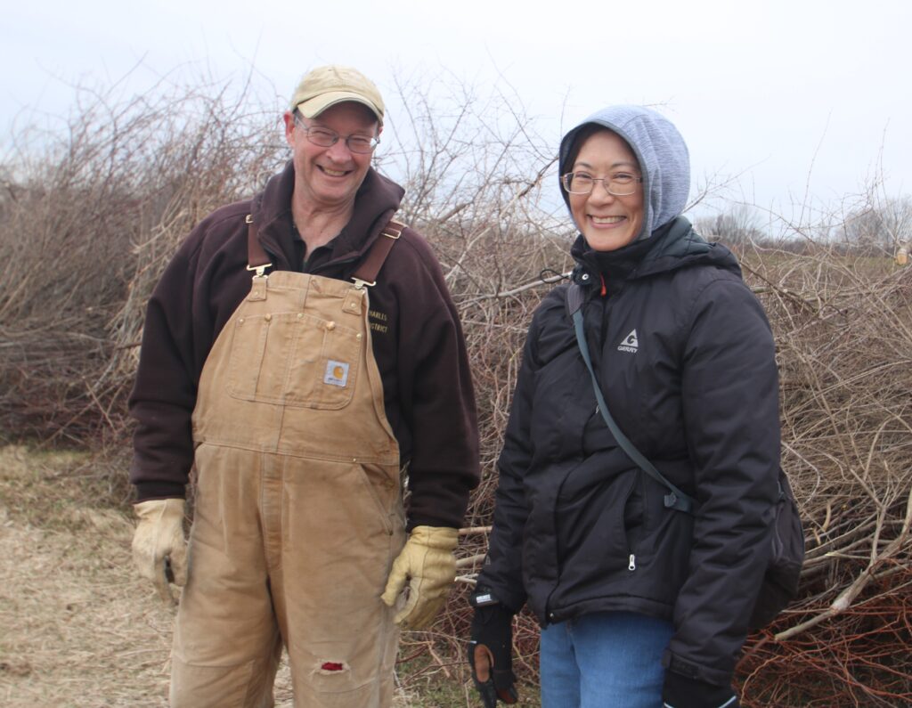 The workday was part of a multiyear project to clear a 43-acre section of shrubland overrun by invasive plants like honeysuckle, buckthorn, black cherry, and others. To date, 17 acres have been cleared. The restoration effort will support habitat for Yellow-breasted Chat, Bell’s Vireo, Brown Thrasher, Yellow Warbler, Gray Catbird, and other shrub-loving species.