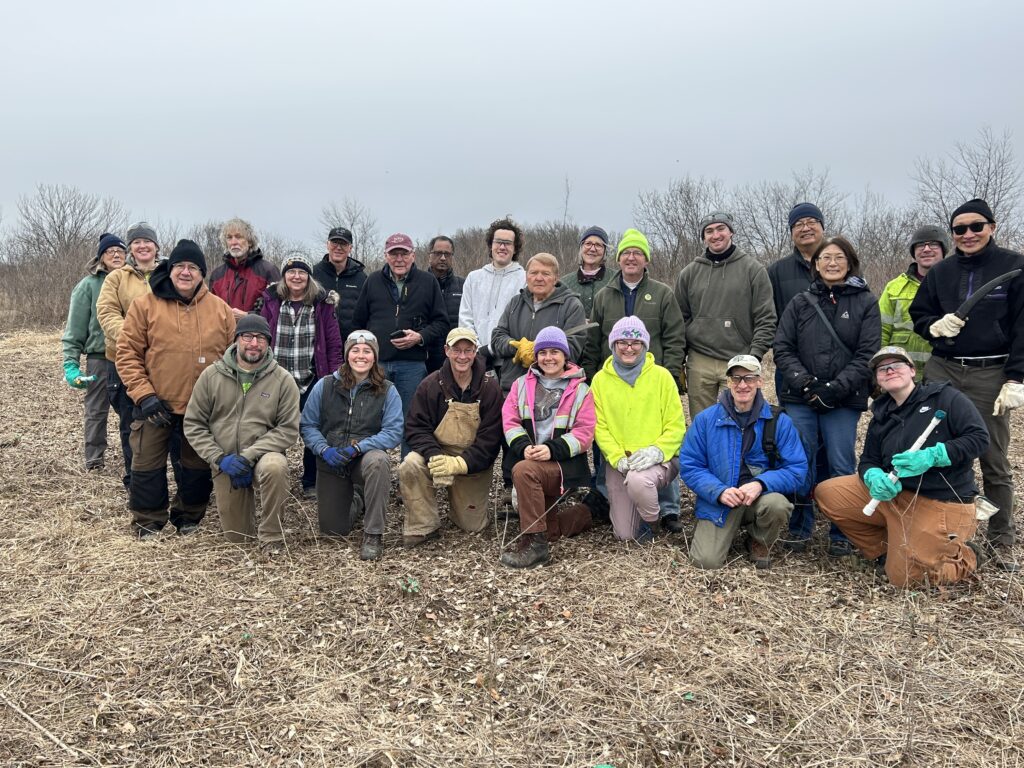 The March 14th Fermilab Workday drew an impressive 25 participants, with DBC members, Fermilab ecologists, and Fermilab Natural Areas volunteers wielding loppers and handsaws to clear a shrubland section of east Fermilab of trees and invasive species. “We made GREAT progress on the restoration of the shrubland,” said organizer Denis Kania, “and it seemed like everyone had a good time as there was a lot of chatter and laughter while we worked.”